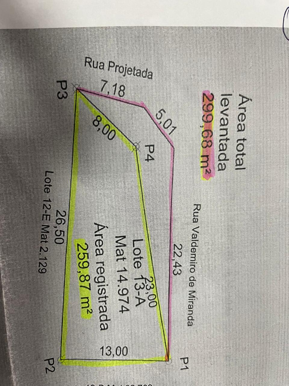Rua Valdomiro de Miranda Quadra 42 lote 13-A Centro, área 259,87m² (F 23,00mts; FU 26,50mts; LD 8,00mts; LE 13,00mts). Valor R$340.000,00