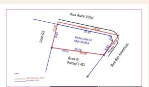 Rua das Américas esquina com à Rua Auta Vidal Quadra “W” lote 01 Centro, área 191,12m² (F 6,43mts + 2,31; FU 9,53,mts; LD 21,61mts e LE 20,76,00mts). Valor R$240.000,00.